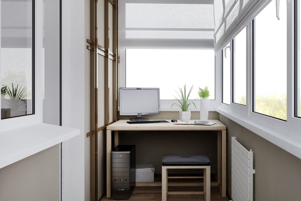 Когда в квартире не находится места для кабинета — почему бы не устроить рабочее место на балконе? Можно поставить письменный стол, удобное кресло, стеллажи.