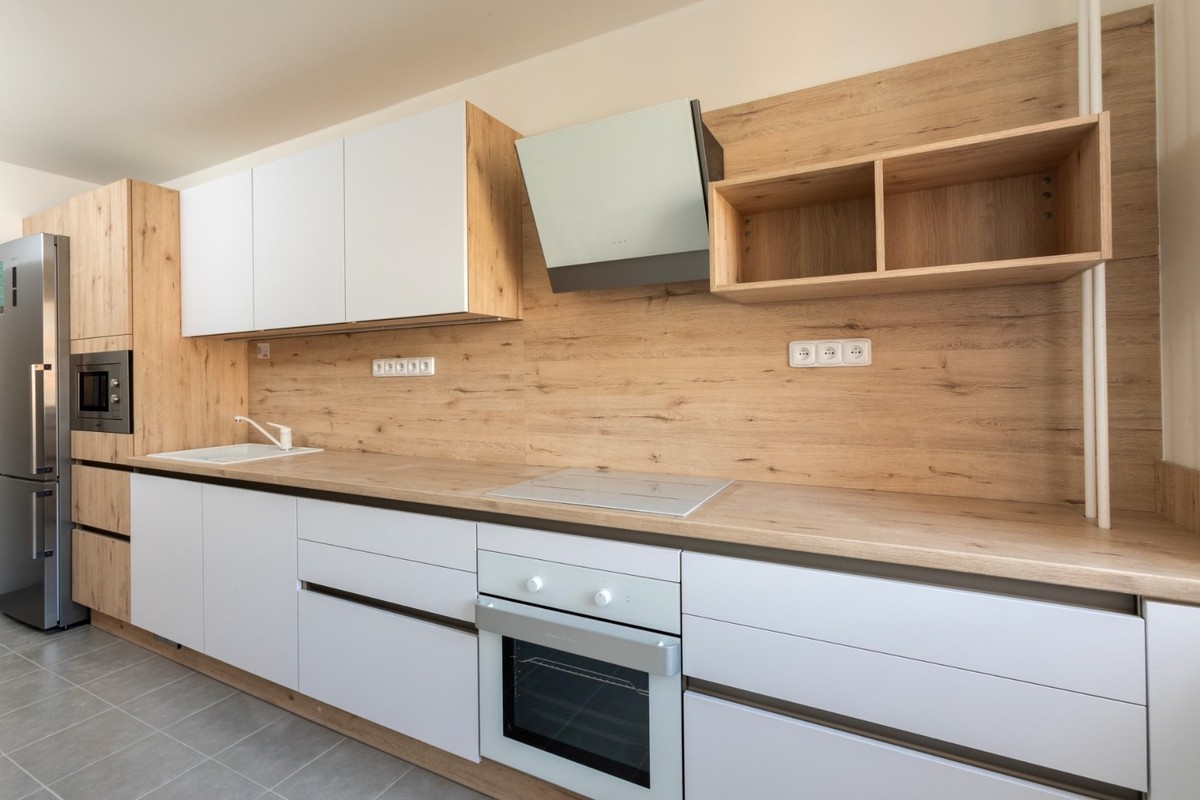 Материал в точности может имитировать натуральное дерево, поэтому такие кухни могут стать наилучшей альтернативой кухням из массива. Можно выбрать матовый вариант отделки или ламинированный, палитра разнообразна, каждый наш заказчик сможет найти то, что нужно именно ему.