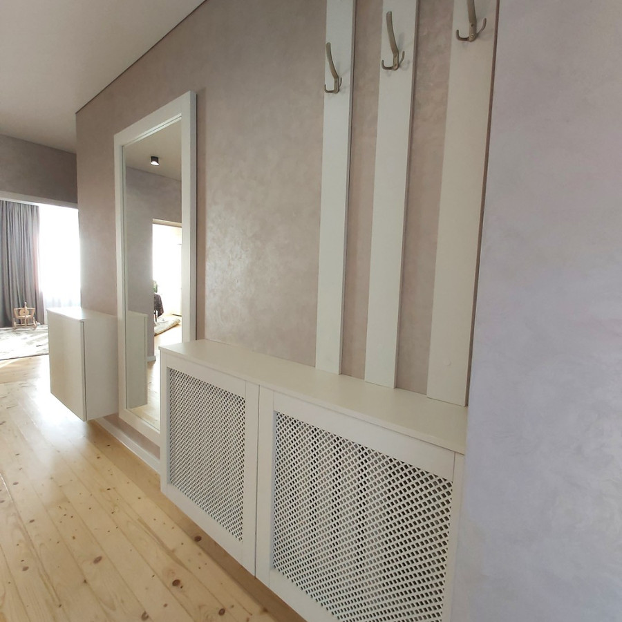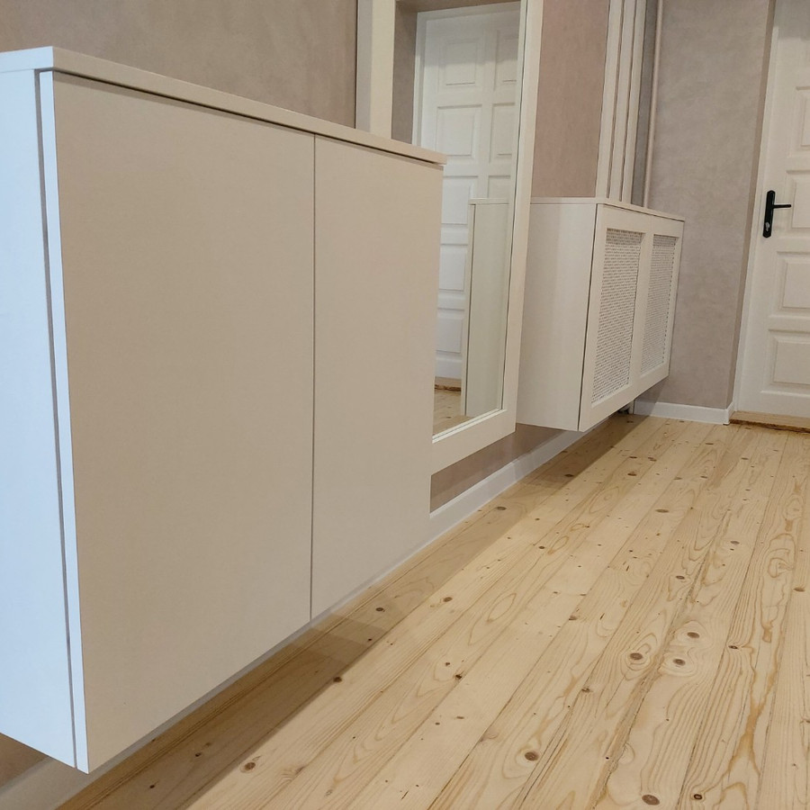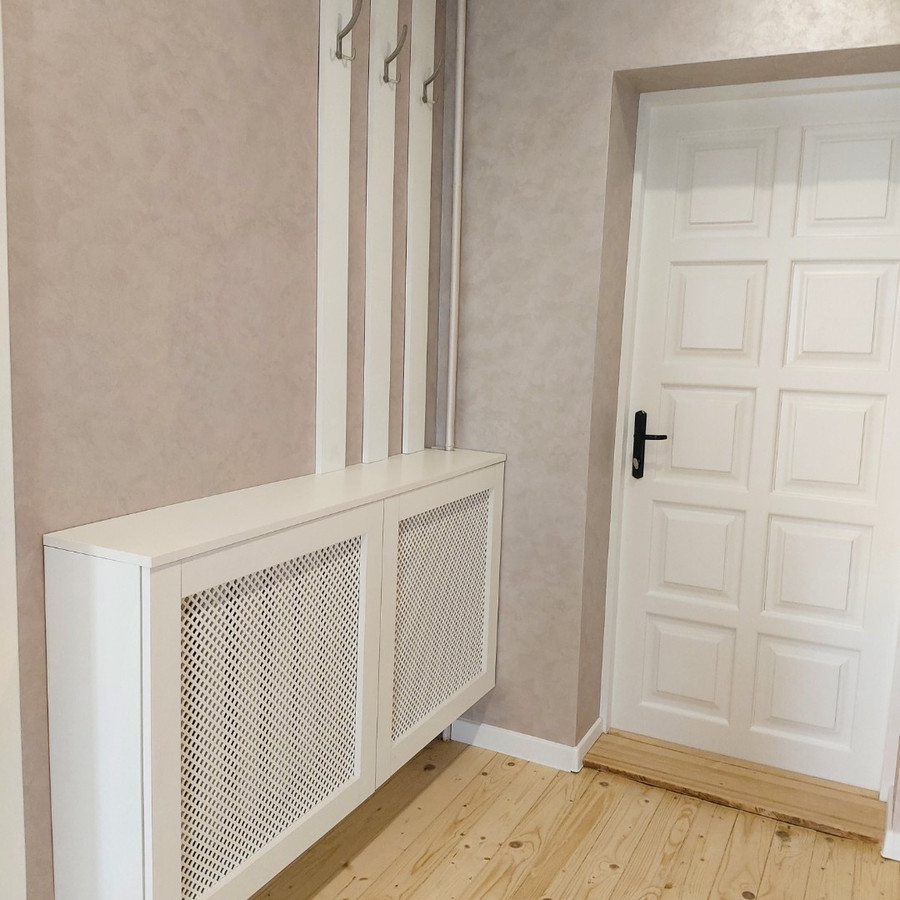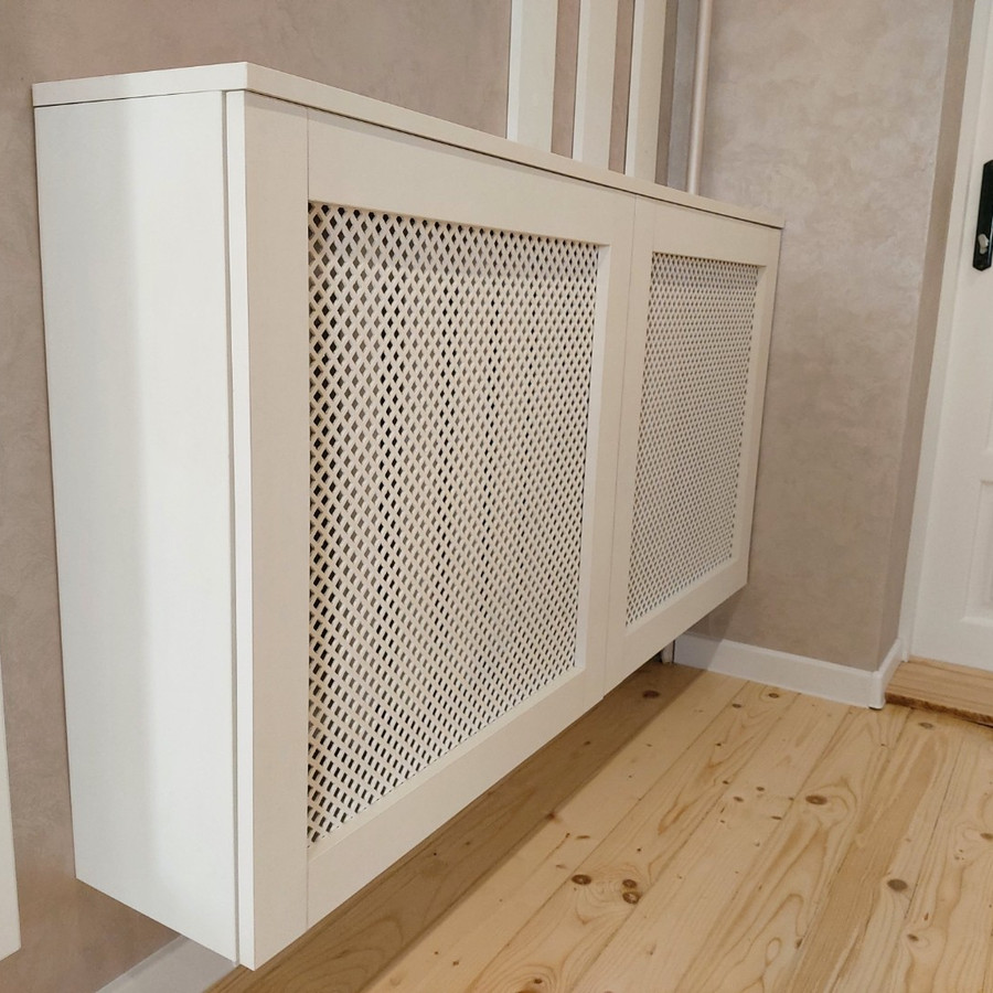 | Фасады | Экран для радиатора с панелью декоративной перфорированной Kronospan Белый жемчуг Зеркало " серебро" |