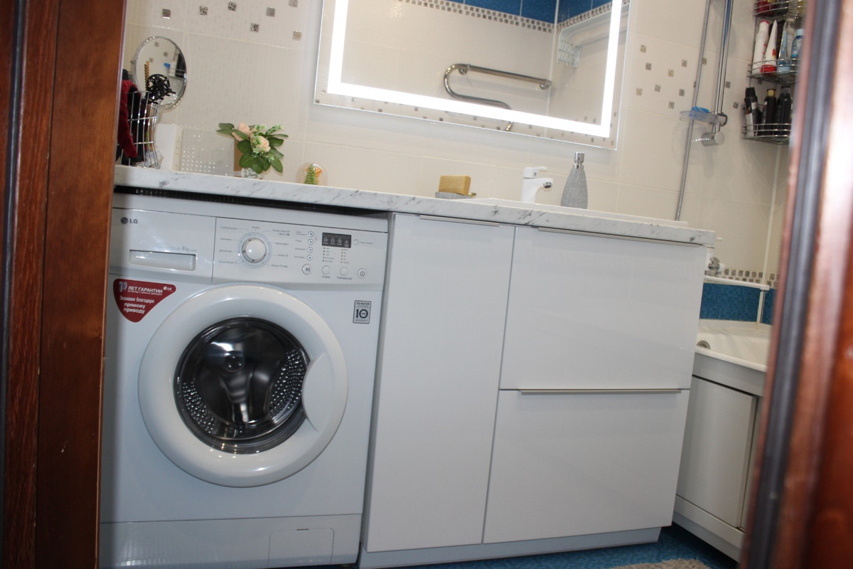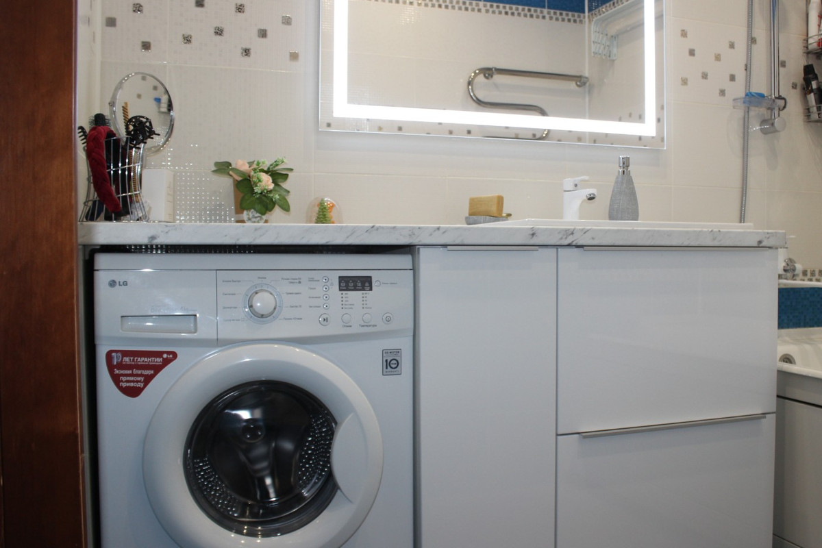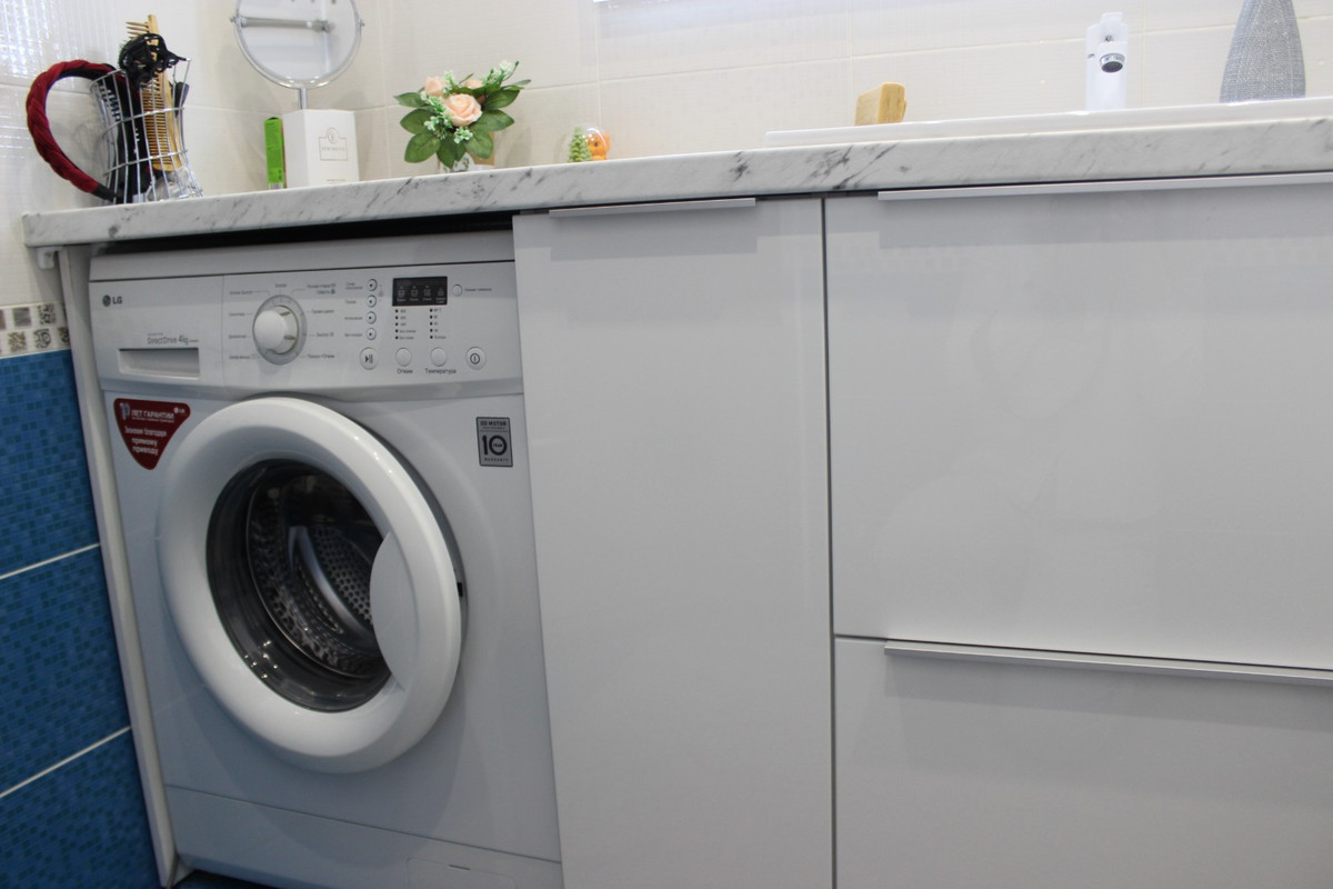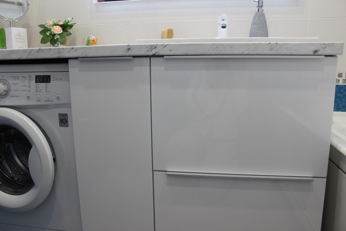 Тумбы под стиральную машинку можно поставить и на кухне, и в ванной комнате. Обычно эти мебельные конструкции выглядят аккуратно и эстетично, делая интерьер более привлекательным и завершенным.